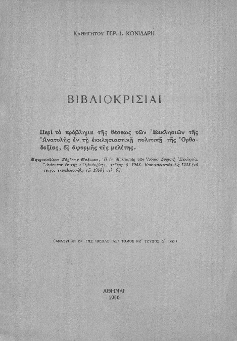 Βιβλιοκρισίαι: περί το πρόβλημα της θέσεως των Εκκλησιών της Ανατολής εν τη εκκλησιαστική πολιτική της Ορθοδοξίας, εξ αφορμής της μελέτης