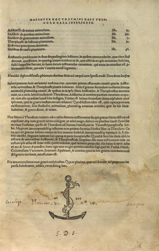 Habentur hoc volumine haec Theodoro Gaza interprete... De natura animalium... de partibus animalium... de generatione animalium. Theophrasti de historia plantarum... de causis plantarum... Alexandri Aprhodisiensis problemata...
