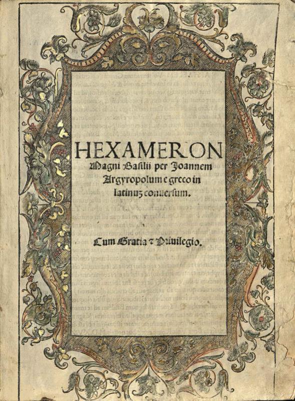 Hexameron, Basilii per Joannem Argyropolum e greco in latinus conversum...