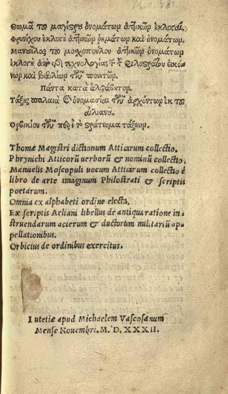 Θωμᾶ τοῦ Μαγίστρου ὀνομάτων ἀττικῶν ἐκλογαί. Φρυνίχου ἐκλογὴ ἀττικῶν ῥημάτων καὶ ὀνομάτων. Μανουήλου τοῦ Μοσχοπούλου ἀττικῶν ὀνομάτων ἐκλογὴ... Τάξις παλαιὰ καὶ ὀνομασίαι τῶν ἀρχόντων ἐκ τοῦ αἰλιανοῦ...