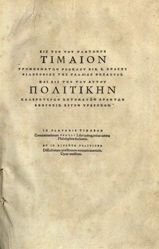 Εἰς τὸν τοῦ Πλάτωνος Τίμαιον Ὑπομνημάτων Πρόκλου... καὶ εἰς τὴν τοῦ αὐτοῦ Πολιτικὴν... ἐξήγησις...