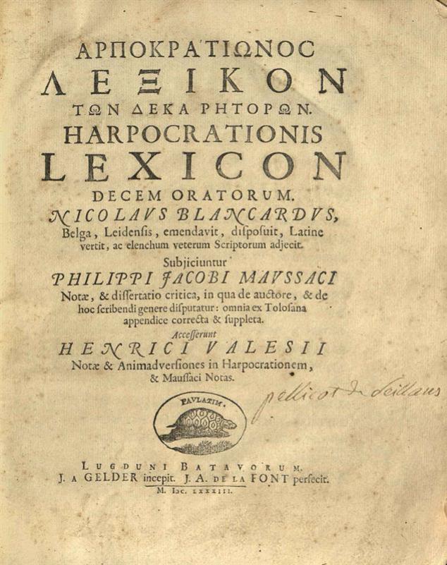 Ἁρποκρατίωνος Λεξικὸν τῶν Δέκα Ρητόρων... Nicolaus Blancardus... Philippi Jacobi Maussaci Notae... Henrici Valesii Notae...