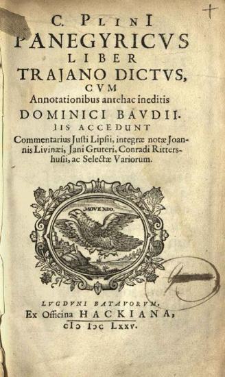 C. Plini Panegyricus Liber Trajano dictus, cum annotationibus antehac ineditis. Dominici Baudii... Commentarius Justi Lipsii... notae Joannis Livinaei, Jani Gruteri, Conradi Rittershusii...