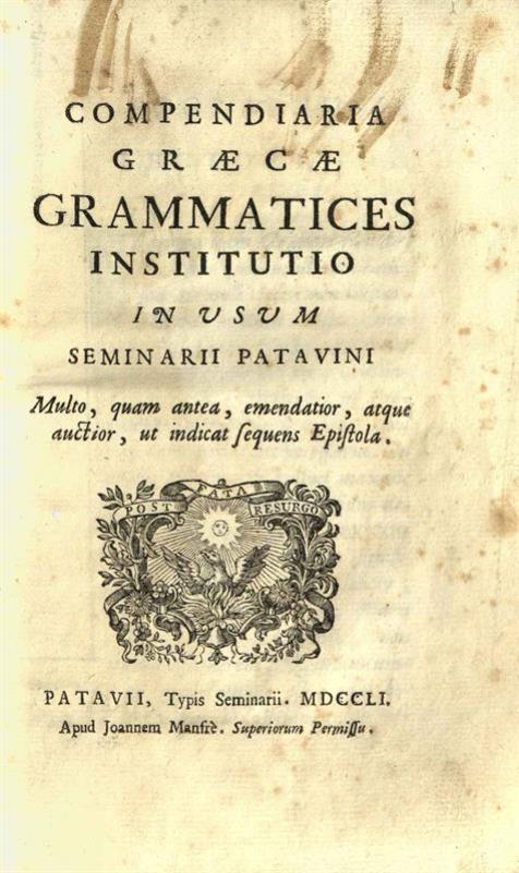 Compendiaria Graecae Grammatices Institutio in usum Seminarii Patavini...