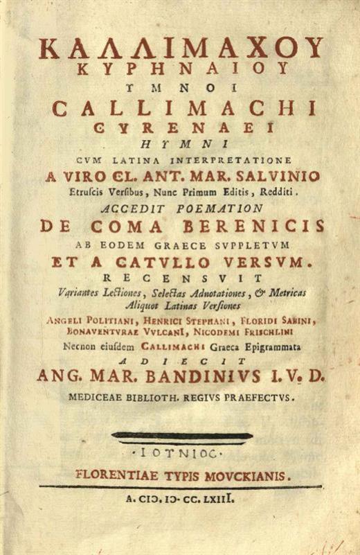 Καλλιμάχου Κυρηναίου Ὕμνοι... interpretatione... Cl. Ant. Mar. Salvinio... De Coma Berenicis ab eodem... et a Catullo... Recensuit... Angeli Politiani, Henrici Stephani, Floridi Sabini, Bonaventurae Vulcani, Nicodemi Frischlini... Callimachi... Epigrammata Adiecit Ang., Mar. Bandinius...