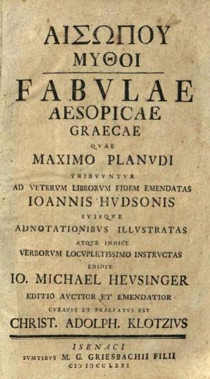 Αἰσώπου Μύθοι..., Maximo Planudi... Ioannis Hudsonis... Io. Michael Heusinger... Christ. Adolph. Klotzius...