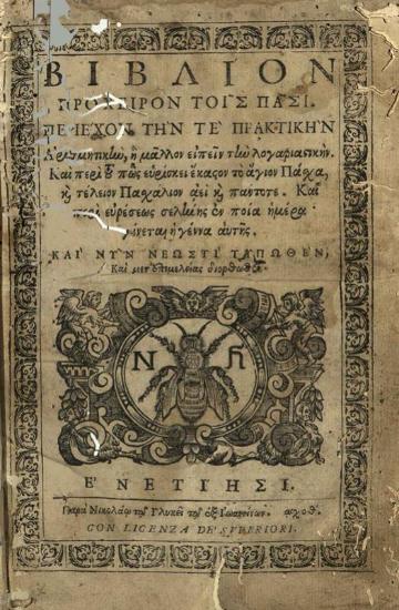 Βιβλίον πρόχειρον τοῖς πᾶσι περιέχον τήν τε Πρακτικὴν Ἀριθμητικήν...
