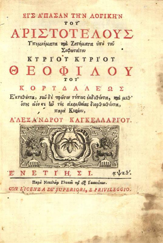 Εἰς ἅπασαν τὴν Λογικὴν τοῦ Ἀριστοτέλους Ὑπομνήματα καὶ Ζητήματα..., Ἐκτεθέντα, νῦν δὲ πρῶτον τύποις ἐκδοθέντα, καὶ μεθ᾽ὅσης... τῆς ἀκριβείας διορθωθέντα παρὰ... Ἀλεξάνδρου Καγκελλαρίου...