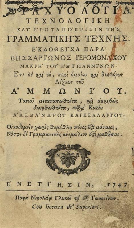 Σταχυολογία Τεχνολογικὴ κατ᾽ ἐρωταπόκρισιν τῆς Γραμματικῆς Τέχνης ἐκδοθεῖσα παρὰ Βησσαρίωνος ἱερομονάχου... καὶ τό, περὶ ὁμοίων καὶ διαφόρων Λέξεων τοῦ Ἀμμωνίου... διορθωθέντα, παρὰ... Ἀλεξάνδρου Καγκελλαρίου...