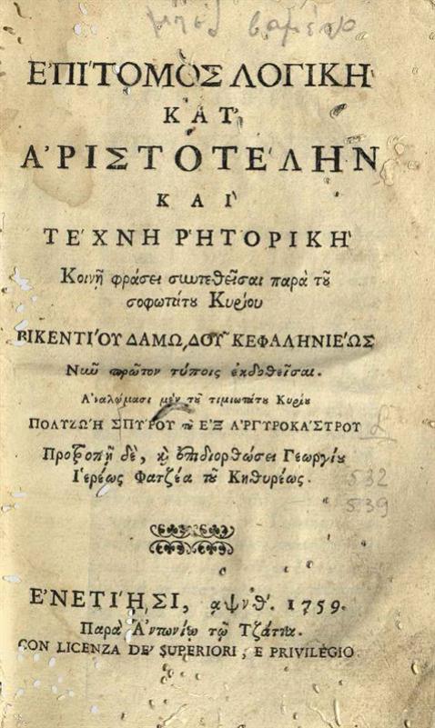 Ἐπίτομος Λογικὴ κατ᾽ Ἀριστοτέλην καὶ Τέχνη ῾Ρητορική....
