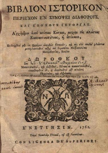 Βιβλίον ἱστορικὸν περιέχον ἐν συνόψει διαφόρους καὶ ἐξόχους ἱστορίας...