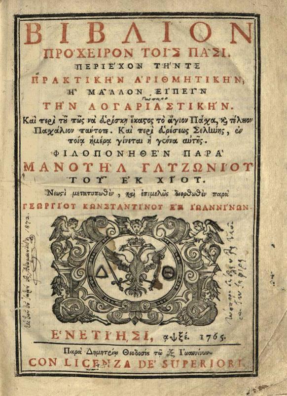 Βιβλίον πρόχειρον τοῖς πᾶσι περιέχον τήν τε Πρακτικὴν Ἀριθμητικὴν... διορθωθὲν παρὰ Γεωργίου Κωνσταντίνου...