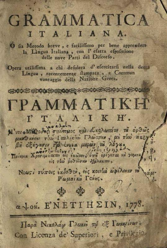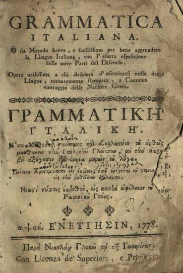 Grammatica Italiana... / Γραμματικὴ Ἰταλικὴ... τοῦ ὀρθῶς μανθάνειν τὴν Ἰταλικὴν Γλῶσσαν, μὲ τὴν ἀκριβῆ ἐξήγησιν τῶν ἐννέα μερῶν τοῦ λόγου...