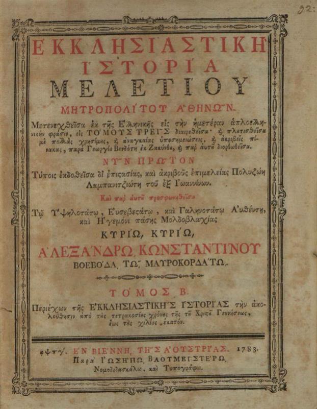 Ἐκκλησιαστικὴ Ἱστορία... μετενεχθεῖσα... εἰς... ἁπλοελληνικὴν... παρὰ Γεωργίου Βενδότη...