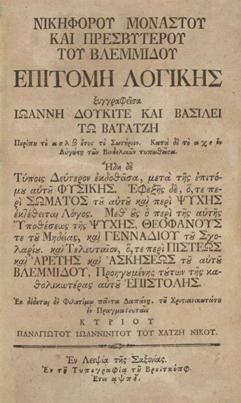 Νικηφόρου Μοναστοῦ καὶ Πρεσβυτέρου τοῦ Βλεμμίδου Ἐπιτομὴ Λογικῆς... μετὰ τῆς ἐπιτόμου αὐτοῦ Φυσικῆς... περὶ Σώματος τοῦ αὐτοῦ καὶ περὶ Ψυχῆς... Λόγος... ὁ περὶ... τῆς Ψυχῆς, Θεοφάνους... Μηδείας, καὶ Γενναδίου τοῦ Σχολαρίου... περὶ Πίστεως καὶ Ἀρετῆς καὶ Ἀσκήσεως τοῦ αὐτοῦ Βλεμμίδου, Προηγουμένης τούτων τῆς καθολικωτέρας αὐτοῦ Ἐπιστολῆς...