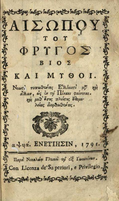 Αἰσώπου τοῦ Φρυγὸς Βίος καὶ Μύθοι. Νεωστὶ τυπωθέντες..., καὶ μεθ’ ὅσης..., ἐπιμελείας διορθωθέντες...