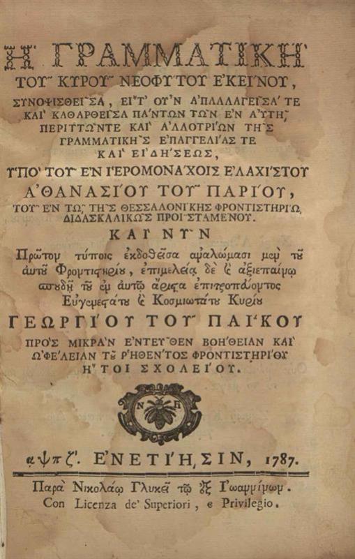 Ἡ Γραμματικὴ... συνοψισθεῖσα... καθαρθεῖσα... ὑπὸ... Ἀθανασίου τοῦ Παρίου...