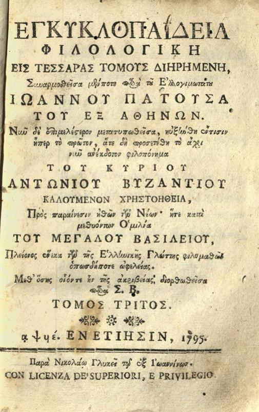 Ἐγκυκλοπαιδεία Φιλολογικὴ... διορθωθεῖσα παρὰ Σ.[πυρίδωνος] Β.[λαντῆ]...