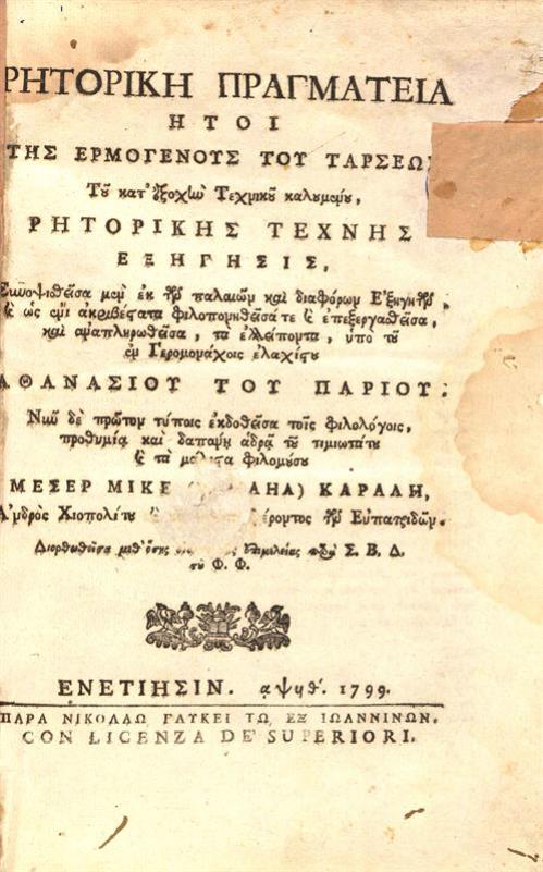 Ρητορικὴ Πραγματεία, ἤτοι τῆς Ἑρμογένους τοῦ Ταρσέως... Ρητορικῆς Τέχνης ἐξήγησις συνοψισθεῖσα μὲν ἐκ τῶν παλαιῶν καὶ διαφόρων ἐξηγήσεων...