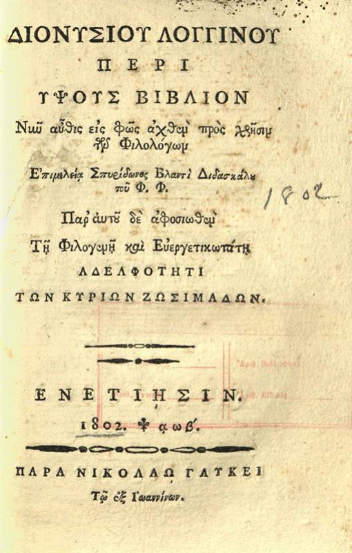 Διονυσίου Λογγίνου Περὶ Ὕψους Βιβλίον..., ἐπιμελείᾳ Σπυρίδωνος Βλαντῆ, διδασκάλου τοῦ Φ.Φ. Παρ’ αὐτοῦ δὲ ἀφοσιωθὲν τῇ Φιλογενῇ καὶ Εὐεργετικωτάτῃ Ἀδελφότητι τῶν Kυρίων Ζωσιμάδων