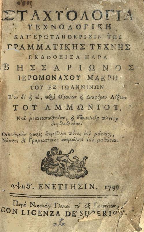 Σταχυολογία Τεχνολογικὴ κατ᾽ ἐρωταπόκρισιν τῆς Γραμματικῆς Τέχνης... καὶ τό, περὶ ὁμοίων καὶ διαφόρων Λέξεων τοῦ Ἀμμω-νίου...
