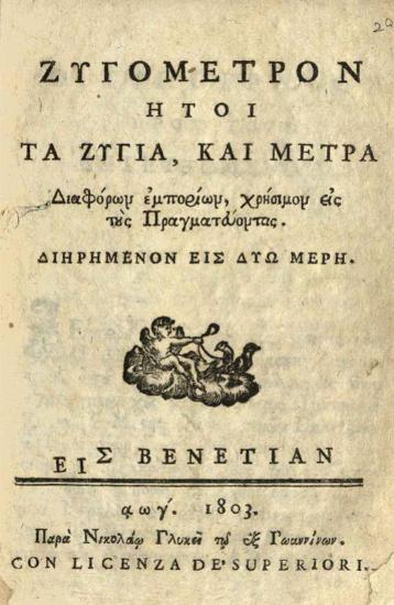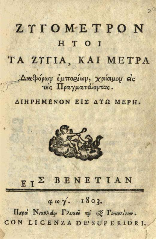 Ζυγόμετρον ἤτοι τὰ ζύγια, καὶ μέτρα διαφόρων ἐμπορίων, χρήσιμον εἰς τοὺς Πραγματεύοντας...