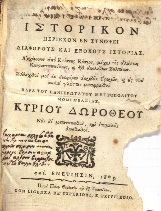 Βιβλίον ἱστορικὸν περιέχον ἐν συνόψει διαφόρους καὶ ἐξόχους ἱστορίας...
