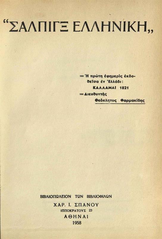Σάλπιγξ Ἑλληνική, «Ἐκ τῆς ἐθνικῆς τυπογραφίας», «Ἐν Καλαμάτα, ἔτει α´ τῆς ἐλευθερίας»