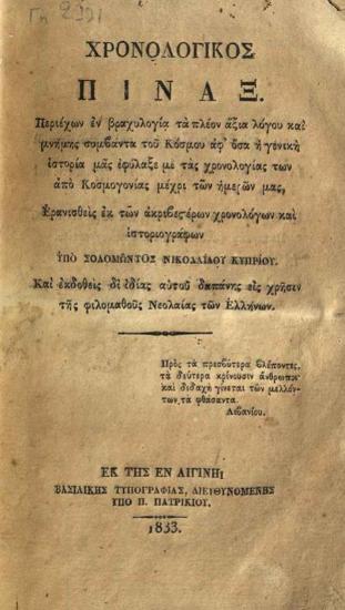 Χρονολογικὸς Πίναξ. Περιέχων ἐν βραχυλογίᾳ τὰ πλέον ἄξια λόγου καὶ μνήμης συμβάντα τοῦ Κόσμου…