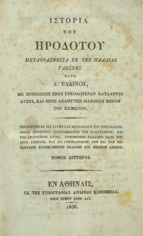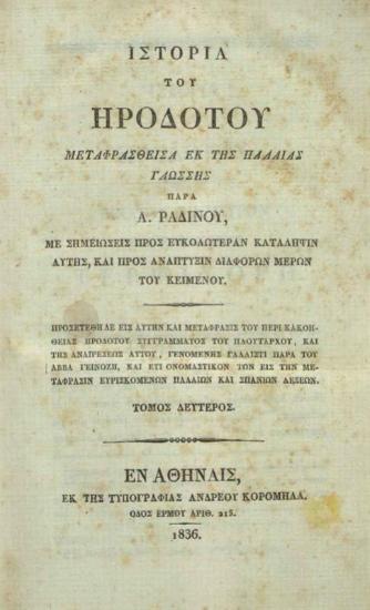 Ἱστορία τοῦ Ἡροδότου μεταφρασθεῖσα ἐκ τῆς παλαιᾶς γλώσσης παρὰ Α. Ραδινοῦ μὲ σημειώσεις πρὸς εὐκολωτέραν κατάληψιν αὐτῆς καὶ πρὸς ἀνάπτυξιν διαφόρων μερῶν τοῦ κειμένου. Προσετέθη δὲ εἰς αὐτὴν καὶ μετάφρασις τοῦ Περὶ Κακοηθείας Ἡροδότου συγγράμματος τοῦ Πλουτάρχου, καὶ τῆς ἀναιρέσεως αὐτοῦ...