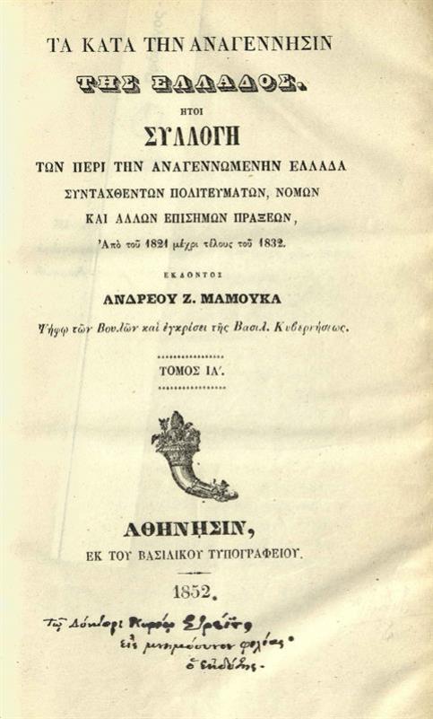 Τὰ κατὰ τὴν ἀναγέννησιν τῆς Ἑλλάδος. Ἤτοι Συλλογὴ τῶν... Πολιτευμάτων, Νόμων καὶ ἄλλων Ἐπισήμων Πράξεων...