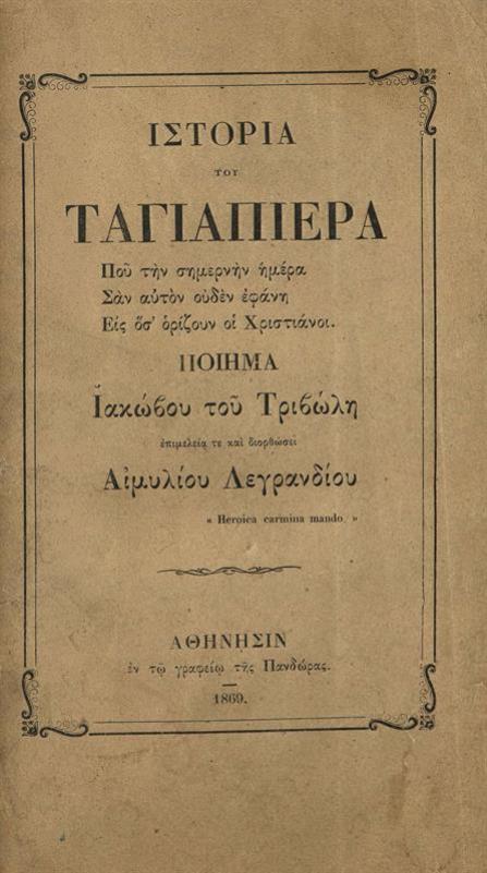 Collection de Monuments... No 3. Histoire de Tagliapietra... / Ἱστορία τοῦ Ταγιαπιέρα... ἐπιμελείᾳ τε καὶ διορθώσει Αἰμυλίου Λεγρανδίου [Ém. Legrand]...
