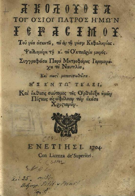 Ἀκολουθία τοῦ ὁσίου... Γερασίμου... Καὶ ἔκθεσις σύντομος τῆς Ὀρθοδόξου ἡμῶν Πίστεως...