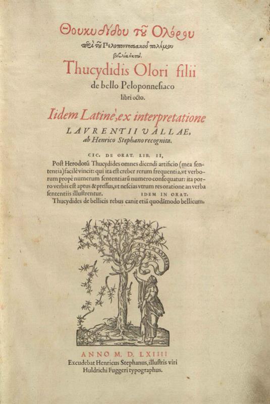 Θουκυδίδου τοῦ Ὀλόρου περὶ τοῦ Πελοποννησιακοῦ πολέμου βιβλία ὀκτώ. Thucydidis Olori filii de bello Peloponnesiaco libri octo. Iidem Latine, ex interpretatione Lavrentii Vallae, ab Henrico Stephano recognita —