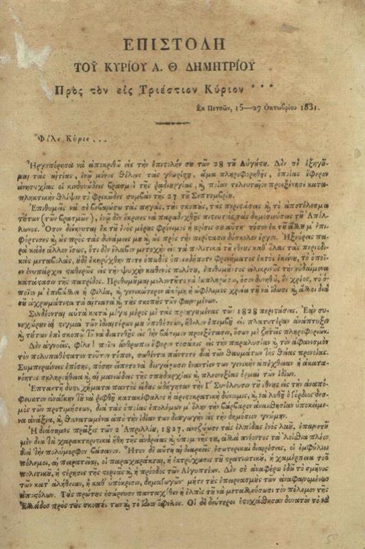 Ἐπιστολὴ τοῦ κυρίου Α. Θ. Δημητρίου Πρὸς τὸν εἰς Τριέστιον Κύριον
