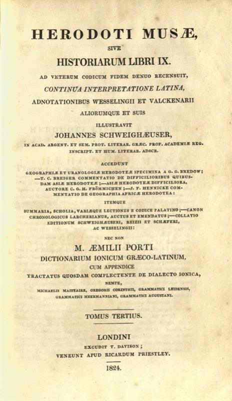 Herodoti Musae, sive Historiarum libri IX — continua interpretatione latina, adnotationibus Wesselingii et Valckenarii — illustravit Johannes Scheighæuser — M. Æmilii Porti Dictionarium Ionicum Græco-latinum—