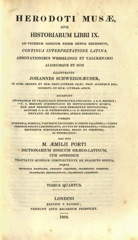 Herodoti Musae, sive Historiarum libri IX — continua interpretatione latina, adnotationibus Wesselingii et Valckenarii — illustravit Johannes Scheighæuser — M. Æmilii Porti Dictionarium Ionicum Græco-latinum—
