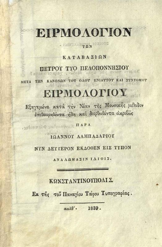 Εἱρμολόγιον τῶν καταβασιῶν — μετὰ τῶν Κανόνων τοῦ ὅλου ἐνιαυτοῦ καὶ συντόμου Εἱρμολογίου — ἐπιθεωρηθέντα — παρὰ Ἰωάννου Λαμαπδαρίου Νῦν δεύτερον ἐκδοθὲν
