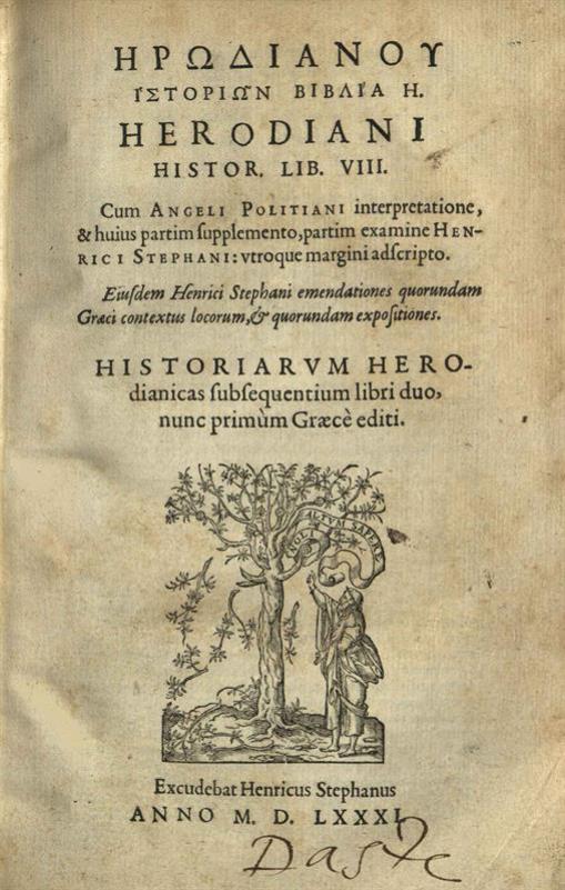Ἡρωδιανοῦ Ἱστοριῶν βιβλία Η. Herodiani Histor. Lib. III. Cum Angeli Politiani interpretattione, & — Henrici Stephani