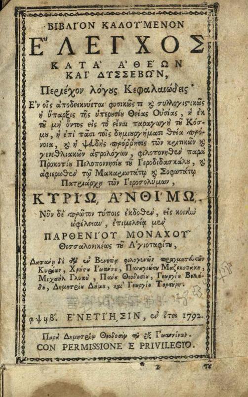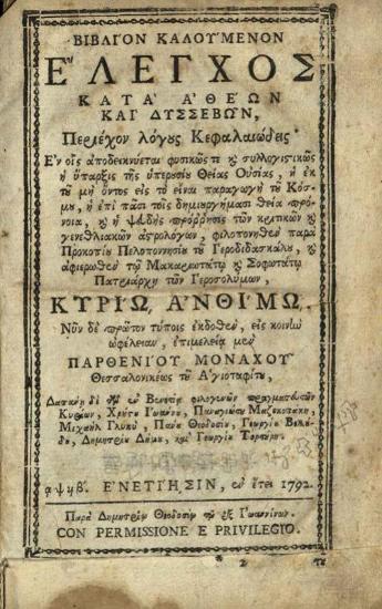 Βιβλίον καλούμενον Ἔλεγχος κατὰ ἀθέων καὶ δυσσεβῶν