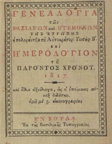 Γεvεαλογία τῶν Βασιλέων καὶ Ἡγεμόνων τῆς Εὐρώπης ἡ τολεράντζα τοῦ Αὐτοκράτορ: Ἰωσὴφ Β´. καὶ Ἡμερολόγιον τοῦ παρόντος χρόνου 1817 καὶ ἄλλα ἀξιόλογα — ὁμοῦ μὲ 5. εἰκονογραφίας