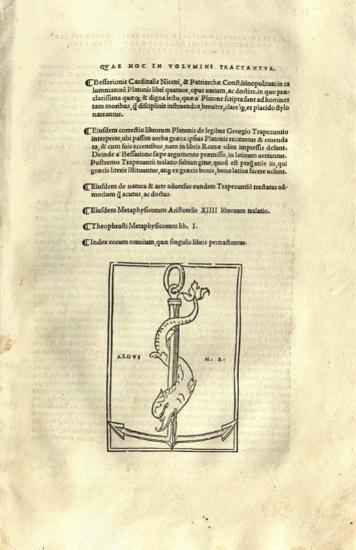 Quae hoc in volumine tractantur Bessarionis Cardinalis Niceni, et Patriarchae Constantinopolitani in calumniatore Platonis --- Eiusdem correctio librorum Platonis de legibus Georgio Trapezuntio interprete --- Eiusdem de natura et arte --- Eiusdem Metaphysicorum Aristotelis XIII librorum tralatio. Theoprasti Metaphysicorum lib. I. Index eorum omnium