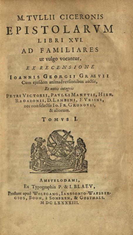 M. Tullii Ciceronis Epistolarum libri XVI ad familiares --- ex recensione Ioannis Georgii Graevii --- Et notis integris Petri Victorii, Pavlli Manutii, Hier. Ragazonii, D. Lambini, F. Ursini, nec non selectis Io. Fr. Cronovii & aliorum