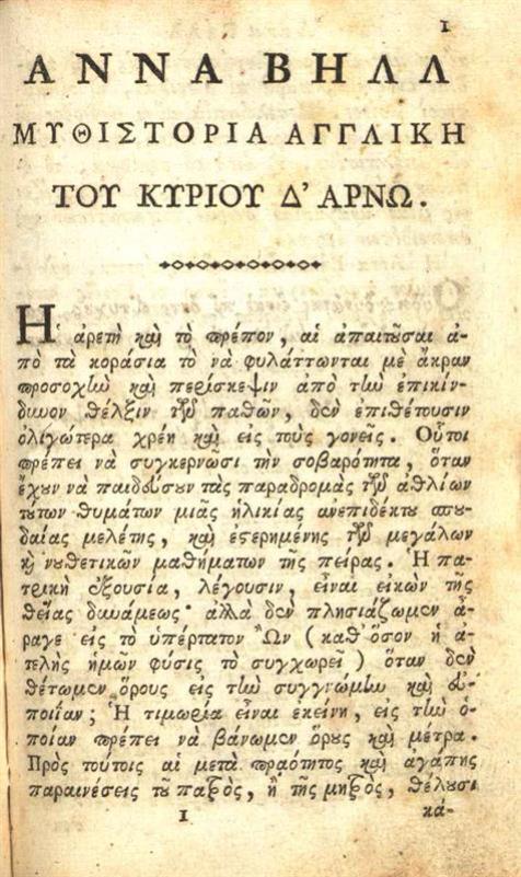 Φραγκίσκος Σοάβε [Francesco Soave]. Ἠθικὰ Διηγήματα τοῦ Φραγκίσκου Σοάβιου νῦν πρῶτον μεταφρασθέντα παρὰ Κωνσταντίνου Οἰκονόμου Τοῦ ἐκ Καββαΐας, ἐπιθεωρηθέντα δὲ μεθ’ ὅσης οἷον τε τῆς ἐπιμελείας παρὰ Σπυρίδωνος Βλαντῆ, Βενετία, Νικόλαος Γλυκύς, 1816.