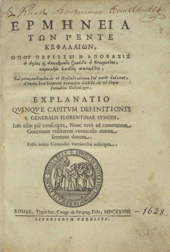Ἑρμηνεία τῶν πέντε κεφαλαίων... Συνόδου τῆς Φλωρεντίας..., Ρώμη, Typis Sac. Congr. de Propag. Fide, 1628.