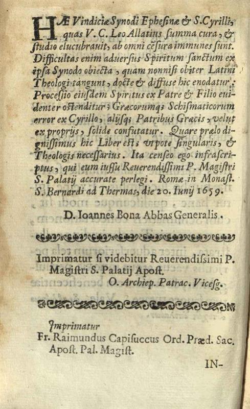 Λέων Ἀλλάτιος. Vindiciae Synodi Ephesinae et S. Cyrilli De processione ex Patre et Filio Spiritus Sancti..., Ρώμη, Typis Sac. Congreg. de Propagandae Fidei, 1661.