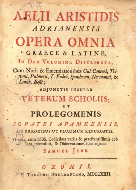 - Αἴλιος Ἀριστείδης, Aelii Aristidis Adrianensis Opera omnia : graece & latine, in duo volumina distribute ; Cum notis & emendationibus Gul. Canteri, Tristani, Palmerii T. Fabri, Spanhemii, Normanni, & Lamb. Bossi ; adjunctis insuper veterum scholiis ; et prolegomenis Sopatri Apameensis --- recensuit, & observationes suas adjecit Samuel Jeeb, Ὀξφόρδη, E Theatro Sheldoniano , tom. 1, 1724.