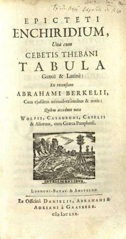 Ἐπίκτητος. Epicteti Enciridium... Cebetis Thebani tabula... ex recensione Abrahami Berkelii... accedunt notae Wolfii, Casauboni, Λέιντεν/ Ἄμ-στερνταμ, ex officinâ Danielis, Abrahami & Adriani à Gaasbeen, 1670.