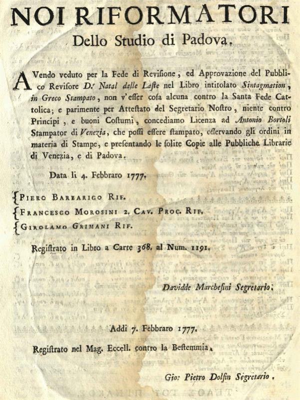 Χρύσανθος Νοταρᾶς. Χρυσάνθου τοῦ Μακαριωτάτου Πατριάρχου τῶν Ἱεροσολύμων Συνταγμάτιον περὶ τῶν Ὀφφικίων, Κληρικάτων, καὶ Ἀρχοντικίων τῆς τοῦ Χριστοῦ Ἁγίας Ἐκκλησίας..., καὶ τῆς σημασίας αὐτῶν... Μετὰ τῶν Ἐγχειριδίων... Γαβριὴλ [Σεβήρου]... Σὺν Ὁμιλίᾳ... Γενναδίου [Σχολαρίου]..., Βενετία, Ἀντώνιος Βόρτολις, 1778.