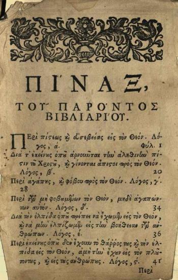 Νεκτάριος Τέρπος. Βιβλίον καλούμενον Πίστις ἀναγκαῖον εἰς κάθε ἁπλοῦν ἄνθρωπον..., Βενετία, Ἀντώνιος Βόρτολις, 1733.